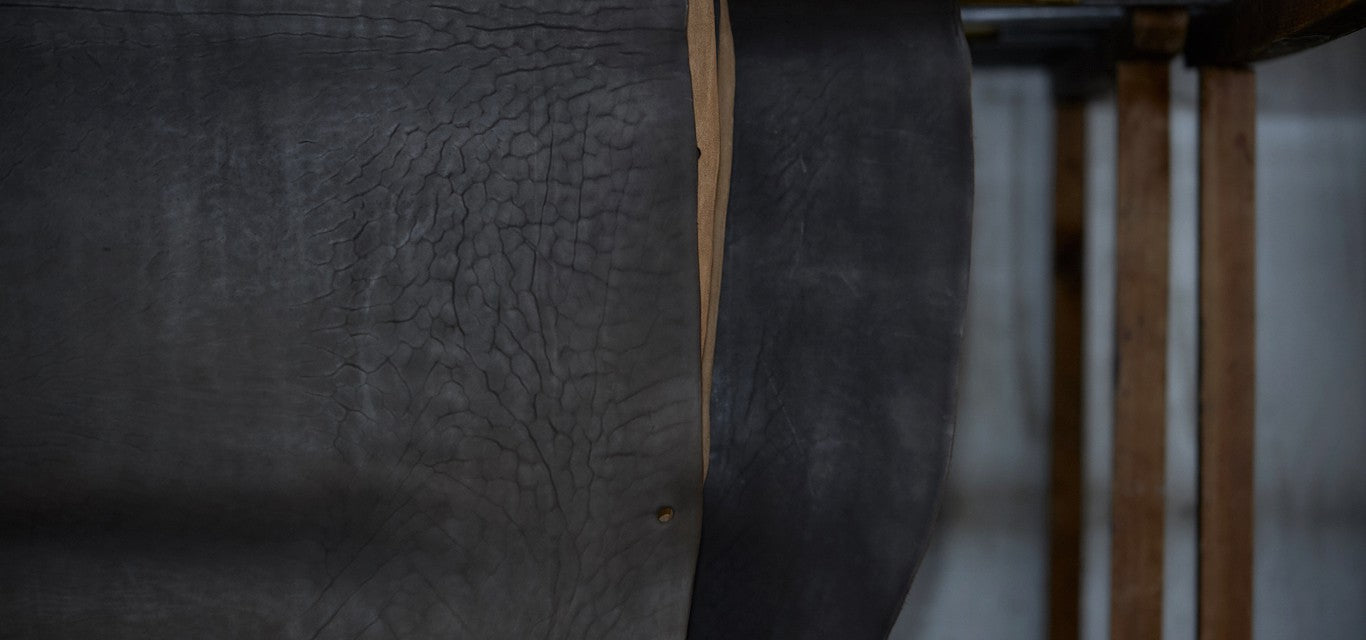 - 成牛のベンズ(首と腹を取り除いた部位)をアウトソール用に仕上げた革。1足分の大きさです。